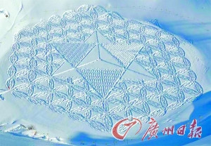 Beck)手中却成为特殊的创作道具。他每天穿上雪鞋,在雪地上用指南针和尺子精确地绘制出规整的几何图案,然后在雪地里来回走上5到9个小时,用自己的足印刻画出复杂多样的几何图案。这些作品面积巨大,内容大多以几何图案为主,据悉,一件约3个足球场面积大的作品,贝克通常要耗费一天左右的时间,有时他也并不着急,慢悠悠地在冰封的湖面上行走数天,享受创作时的喜悦心情。倘若你此时从远处或高处观察贝克的足迹,你便能清晰地看到他的足迹慢慢变成美妙图案的过程。