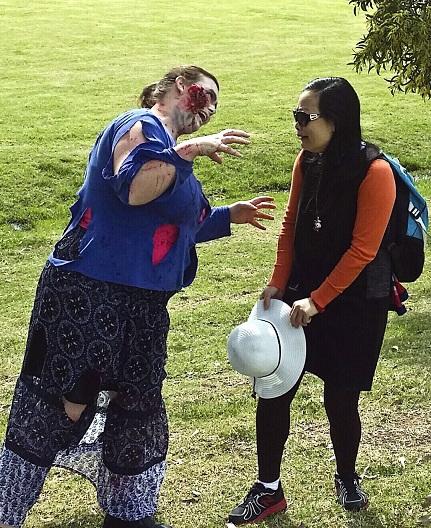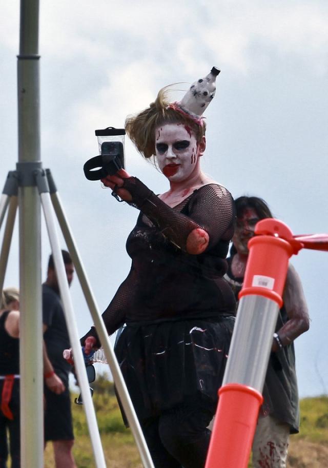 一名“丧尸”在“僵尸跑”活动中自拍。