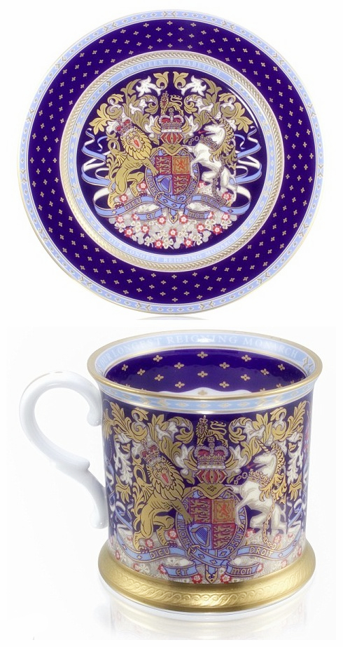 (专为庆祝女王成为“最长待机君主”而设计的瓷杯与瓷盘。)