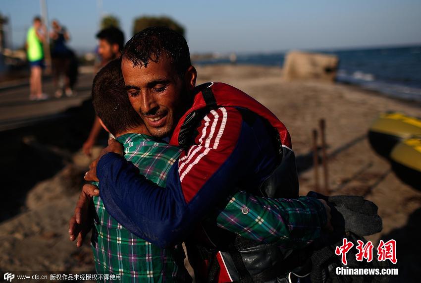 8月29日,一个来自巴勒斯坦的大人在希腊科斯登陆后,深情拥抱了和他一样暂时躲过死亡的孩子,他们搭乘小船从土耳其出发穿越了爱琴海终于到达希腊。但这里并不是他们的终点,移民之路刚刚开始。