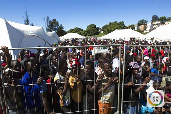 2015年4月18日,在南非德班的难民安置营地,马拉维人排队准备乘坐大巴回国。