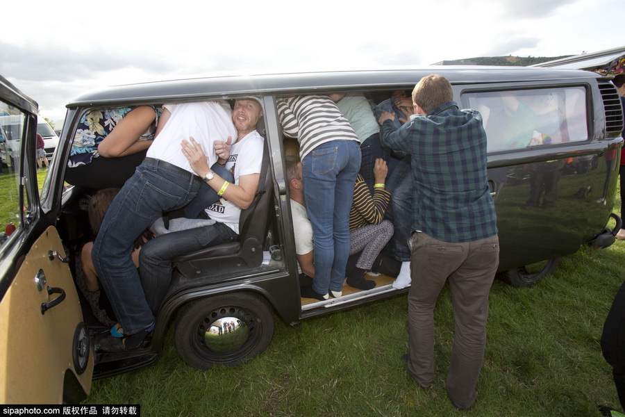 当地时间2015年9月5日,英国伍斯特郡莫尔文,公车节(Busfest)期间,当地民众试图尝试挤进一辆大众面包车,以打破吉尼斯世界记录。最终,共有51人挤进了这辆车。(图片来源:Sipa)