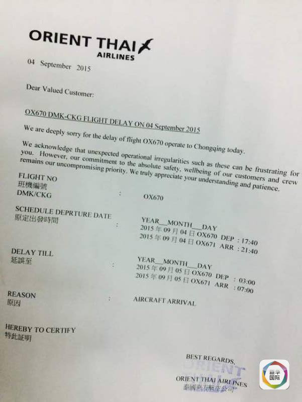 图为泰国东方航空公司开具的航班延误证明(图片由当事人提供)