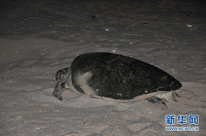 绿海龟产卵后离开海滩返回大海。新华社记者孙磊 摄