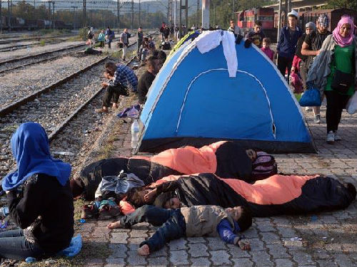 9月5日,在希腊边境,难民们睡在火车站里等待进入马其顿。新华社 法新