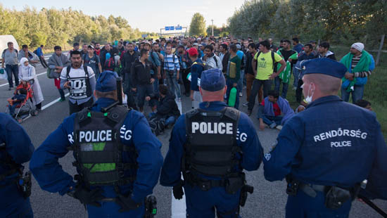 当地时间9月7日,在匈牙利罗斯泽克的一群难民拒绝前往一个临时难民所,冲上附近的高速公路,与警方发生冲突。警方喷洒了辣椒水,以阻止难民越过警戒线。CFP供图