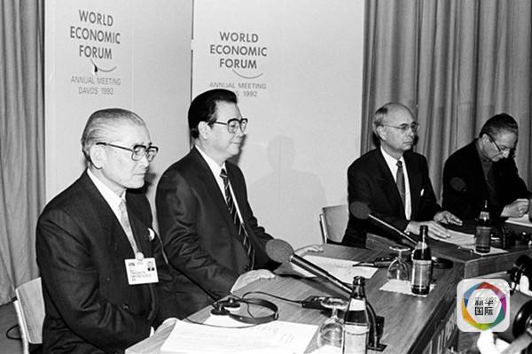 1992年1月30日,正在瑞士访问的国务院总理李鹏(左二)出席达沃斯论坛年会开幕式。(新华社记者齐铁砚摄)