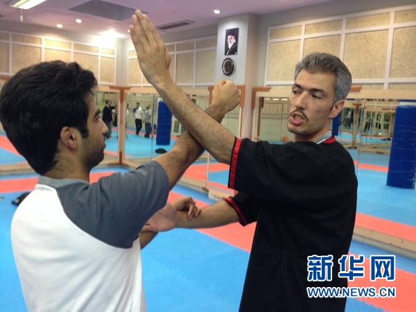 9月初的一个傍晚,在伊朗首都德黑兰市区北部的一处练功房里,“师傅”贝赫鲁斯正带领5名弟子练拳。右拳变掌,掌心向上,手掌经过身体的中线位置朝前斜向上摊出,是为摊手;起肘、落手的动作与摊手相反即为傍手……弟子们对练后,贝赫鲁斯也亲自下场,一招招讲解。