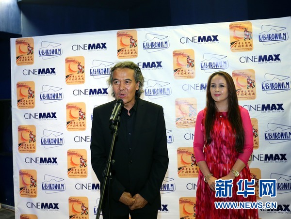 9月9日,在阿拉木图,电影《真爱》导演西尔扎提·牙合甫和女主演孔都孜扎依·塔西在开幕式上同观众见面。新华社记者周良 摄