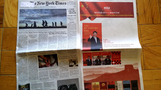 日前,美国《纽约时报》9月7日在第五版面推出彩色整版宣传广告,推介《习近平时代》和《习大大说如何读经典》两本英文图书。美国中文网和美国侨报网9月9日均以“纽约时报高调力挺习近平访美”等字样为题刊发文章报道此事。作为一家有影响力的美国报纸,《纽约时报》的版面上自然不会缺少习大大的身影,《纽约时报》又是如何报道和评述习近平的呢?
