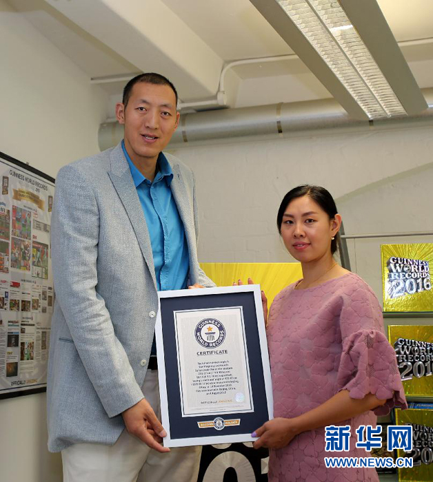 世界最高夫妻”造访吉尼斯世界纪录总部 9月10日,在英国伦敦吉尼斯世界纪录总部,来自中国的前篮球运动员孙明明(左)与妻子、前手球运动员徐艳合影。孙明明与徐艳于2013年8月4日在北京喜结连理。2013年11月14日,经测量,孙明明身高236.17厘米,徐艳身高187.3厘米,从而以身高总和423.47厘米成为世界最高夫妻,打破该项目吉尼斯世界纪录。新华社记者韩岩摄