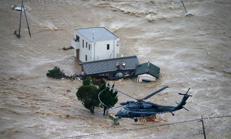 日本暴雨致上万房屋被淹 居民抱狗爬屋顶等救援(组图)