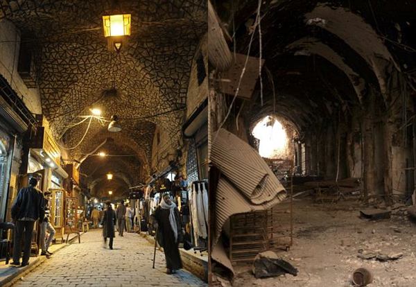 图为战争对叙利亚古城阿勒颇造成的破坏。2004年的人口普查显示,阿勒颇拥有231万人口,比叙利亚首都大马士革还多。该城是人类最古老的定居点之一,考古学发现在公元前第11个千年时这里就有人居住。