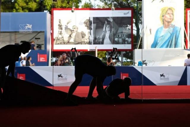 ↑9月1日,在意大利威尼斯利多岛电影宫,工作人员准备红地毯。新华社记者金宇摄