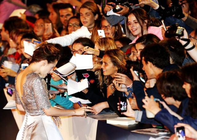 ↑9月5日,《同等族群》女主角扮演者“暮光女”克里斯汀·斯图尔特在首映式与影迷互动。新华社记者叶平凡摄