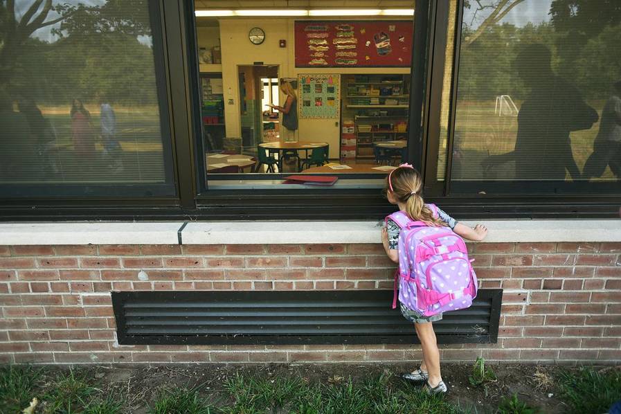 过去的几周时间,全世界各地的孩子们陆续返校,开启了新学期生活。一起来围观这些孩子们开学时的状态。图为当地时间9月2日,美国新泽西州的一个小学生,从窗外偷看自己的教室。