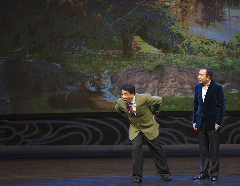 两个多小时的演出中,姜昆的表演占了近三分之二。他在接受新华国际客户端采访时说:“这台表演讲的是‘传承’,讲的是老一辈相声演员怎样热爱表演艺术,我们怎样继承,现在我们又怎么鼓励年轻人把相声艺术传承下去。”从讲述李文华等老一辈相声艺术家的感人事迹,到与80后、90后相声新秀一起在台上蹦蹦跳跳,姜昆“传承”的良苦用心真真切切地展现在观众眼前。