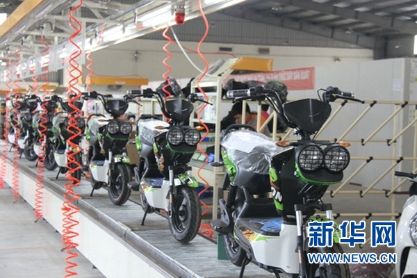 生产线上组装完毕等待最后一步检测的雅迪电动车。雅迪电动车于2014年7月入驻越南首都河内章美县的富义工业园区,目前月生产量为12000台。新华社记者乐艳娜 摄