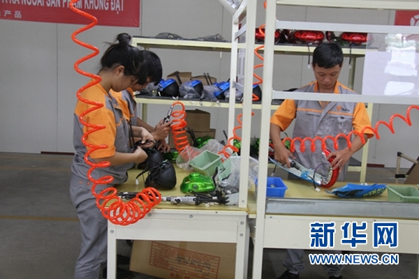 工人们在雅迪电动车工厂内焊接零件。雅迪电动车于2014年7月入驻越南首都河内章美县的富义工业园区,目前月生产量为12000台。新华社记者乐艳娜 摄