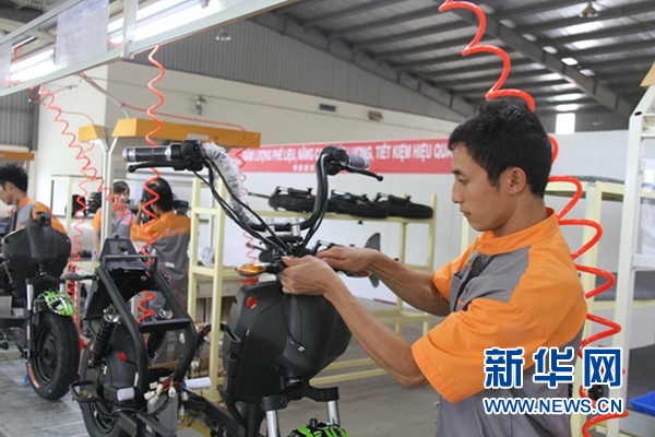 工人在雅迪电动车工厂内组装电动车。雅迪电动车于2014年7月入驻越南首都河内章美县的富义工业园区,目前月生产量为12000台。新华社记者乐艳娜 摄