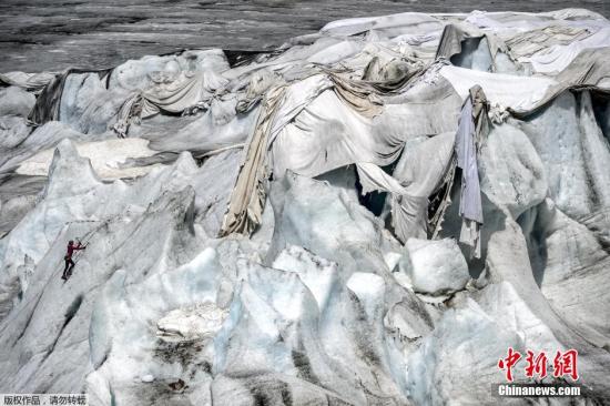 资料图:7月14日,在瑞士阿尔卑斯山脉的罗纳冰川,一名女子在保护冰川的隔热材料附近进行冰上攀岩。瑞士罗纳冰川位于瑞士瓦莱州。瑞士壮美的冰川景观吸引着世界各地游客。受全球气候变暖影响,瑞士冰川不断消融。