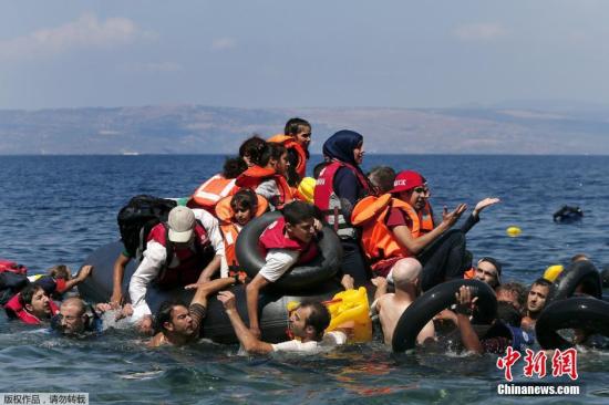 当地时间2015年9月13日,希腊莱斯博斯岛,承载叙利亚和阿富汗难民的一橡皮艇在靠近莱斯博斯岛100米远处泄气,当地民众和志愿者对难民进行了援助,难民们靠救生圈和游泳上岸。