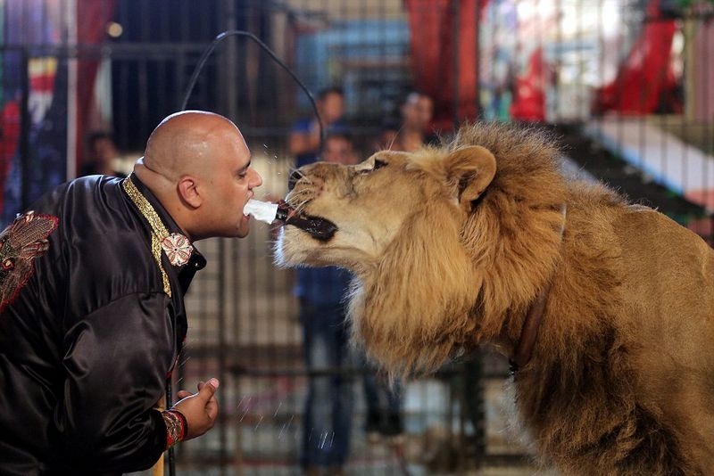 埃及马戏团狮子口衔刀具放驯兽师口中 2015年8月16日消息,埃及马戏团的驯兽师穆罕默德(Mohamed)让一头狮子口衔刀具,送入他的口中,场面可谓惊心动魄、令人心悸不已。随后,当穆罕默德的脸离狮子锋利无比的牙齿仅有几英寸距离时,观众可以清晰地看到,他的脸上全是汗。他还用两只棍子引导狮子,让狮子进行一系列的马戏表演,引得观众拍手叫好。