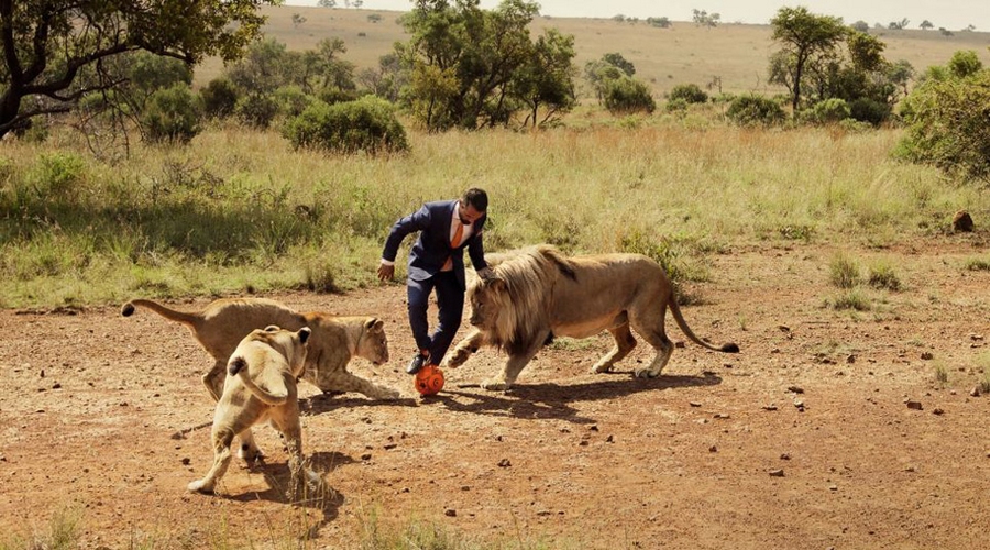 非洲管理员与狮子踢足球呼吁保护动物( 一个网络短片展示了被称作“狮语者”的动物园管理员凯文(Kevin Richardson)与三只狮子上演的一场足球对决。该管理员用20年的时间与令人心生畏惧的狮子、鬣狗们生活在一起,和它们建立友谊。凯文希望人类也能够意识到自己的责任所在,减少由于非法狩猎、非法交易以及对大自然的破坏。