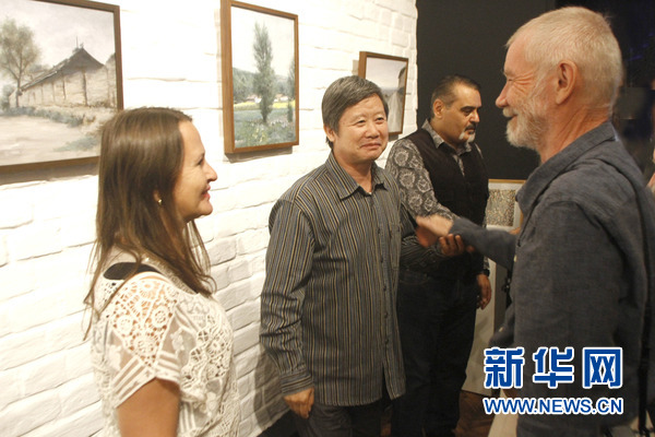 何立宏(中)与罗马尼亚艺术家交谈。新华社发(佩特雷斯库摄)