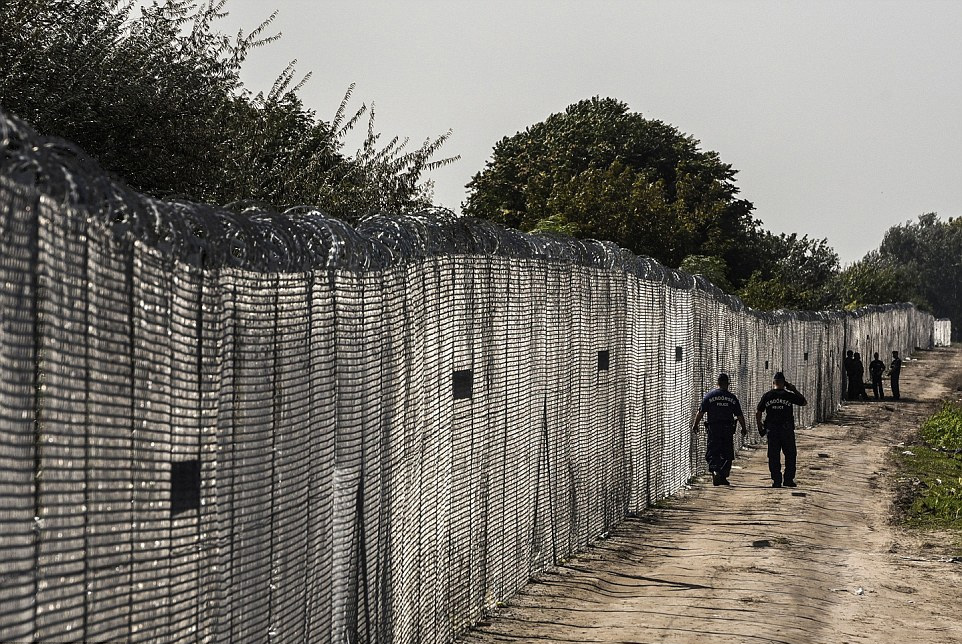 匈牙利边境警察沿着匈牙利与塞尔维亚边境霍尔果斯附近铁丝网巡逻。