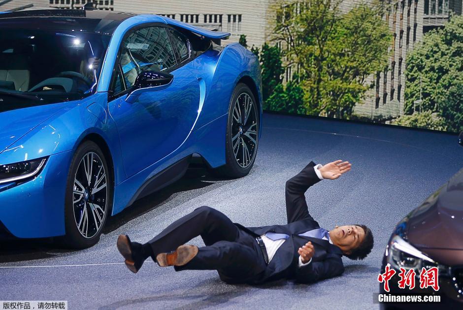 当地时间2015年9月15日,德国法兰克福,2015法兰克福国际车展新闻发布会上,宝马CEO哈拉特-克吕格尔不小心滑倒,被工作人员架走。