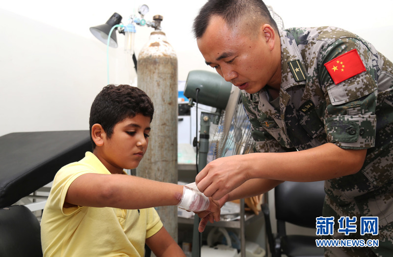 中国首批赴黎巴嫩维和建筑分队军医为嫩巴嫩当地村民看病。新华社发(王永安摄)