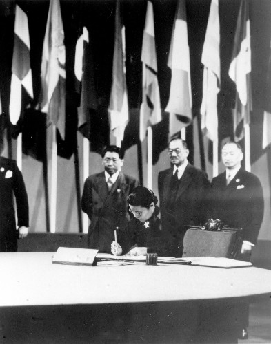 1945年10月24日,《联合国宪章》经安全理事会的5个常任理事国以及其他签字国过半数批准,开始正式生效。联合国作为第二次世界大战之后最大的国际性组织正式成立。此后,这一天被定为联合国日。图为中国代表团成员吴贻芳(前)在宪章上签字。 新华社发