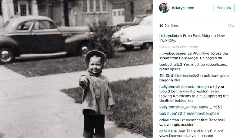 在社交媒体上,希拉里的照片试图向选民展示,这位前国务卿、第一夫人、参议员有相当普通的美国人的童年。(网页截图)