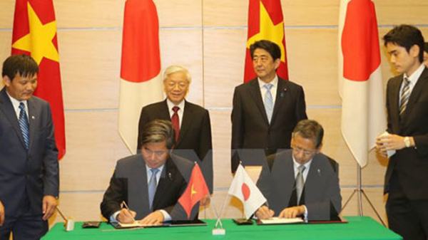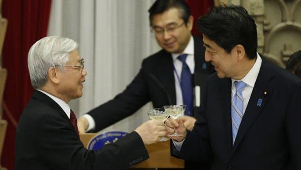 越通社报道是这样说的:“在各层面防务交流上,安倍表示愿与越南合作提升其海上执法能力。日本政府将向越南提供二手船舶,并在联合国维和行动中为其提供协助。越南和日本还将加强协调,以应对传统和非传统安全威胁。在地区和全球问题上,安倍向其客人(阮富仲)介绍了日本在一些历史问题上的立场,以及在地区和平与安全方面的政策。越南客人(阮富仲)重申了他的国家对于坚持和平发展的承诺,并支持日本为本地区及其他地区的和平、安全、合作和发展发挥建设性作用。”