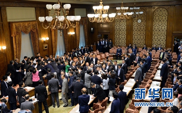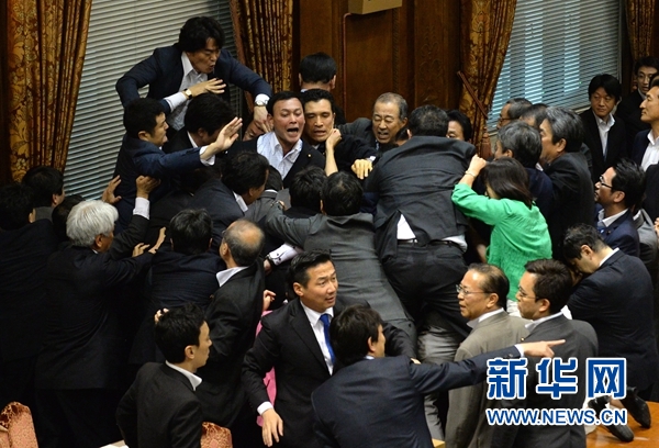 9月17日,在日本东京国会参议院,在野党议员阻止特别委员会表决安保法案。当日,在民众和在野党的强烈反对声中,日本参议院和平安全法制特别委员会强行进行表决,通过了与行使集体自卫权相关的安保法案。新华社记者马平摄