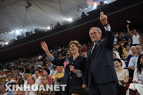 2008年8月8日,美国总统布什和夫人在北京奥运会开幕式上向运动员致意。新华社记者赵鹏 摄