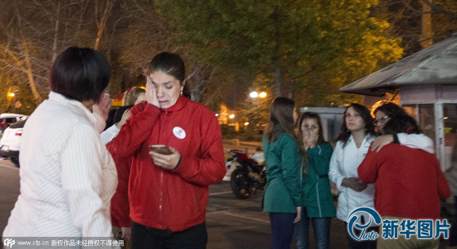 当地时间2015年9月16日,智利圣地亚哥,民众离开建筑跑到街上。智利伊亚佩尔西北发生地震,美国地质勘探局监测震级为7.9级,深度8公里。当地已发布海啸预警。智利首都震感强烈,民众跑向街头躲避。图片来源:CFP