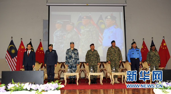 9月18日,马来西亚武装部队司令祖基费利上将(左四)与中方观摩团团长、解放军副总参谋长乙晓光空军中将(左三)出席“和平友谊-2015”中马实兵联合演习开始仪式。当日,“和平友谊-2015”中马实兵联合演习在马来西亚雪兰莪州梳邦机场举行开始仪式。 新华社发(江山摄)