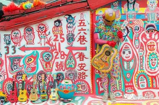 如果你来过彩虹眷村,一定见过他,他站在彩虹眷村的门口,头戴钢铁人头盔,身穿彩虹色战袍,弹着彩虹爷爷为他手绘的吉他,他叫做“彩虹战士”,每天准时在彩虹眷村站岗。(够台湾旅人工作室)