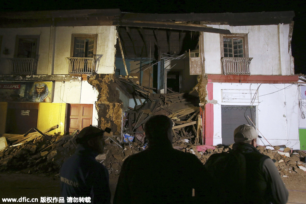 当地时间2015年9月17日,智利伊拉帕尔,智利民众看着在地震中损毁的房屋。智利西部海岸发生8.3级地震,造成8人死亡,1人失踪,数百万人紧急疏散。图片来源:东方IC