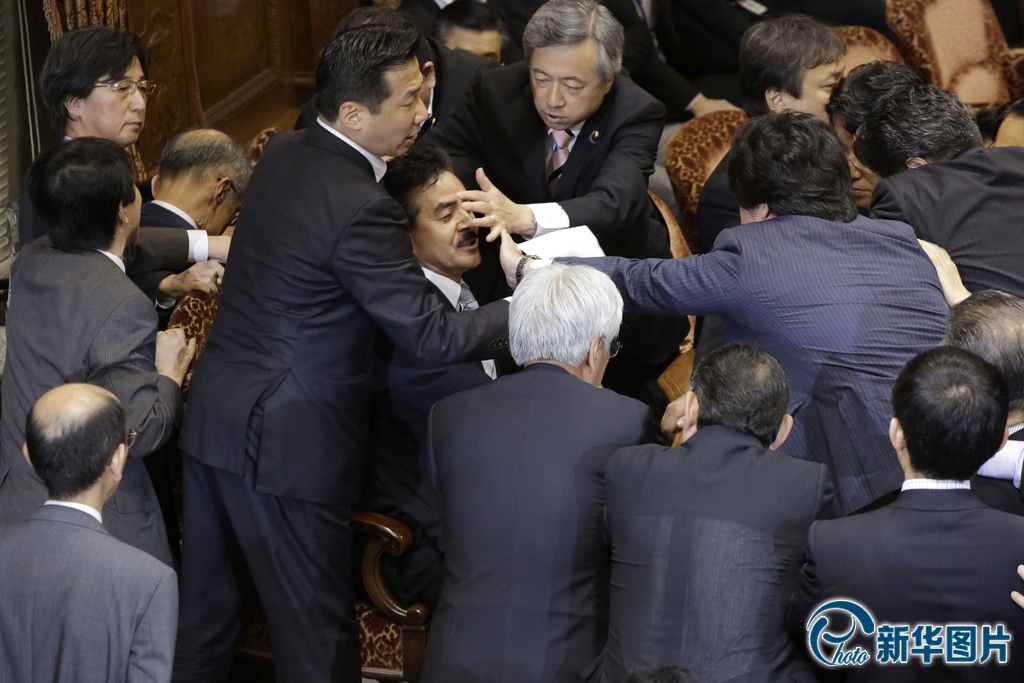 当地时间2015年9月17日,日本东京,日本执政党与在野党围绕参院和平安全法制特别委员会上表决安保相关法案一事继续展开激烈交锋。图为日本执政党议员佐藤正久遭反对派议员围堵。图片来源:东方IC