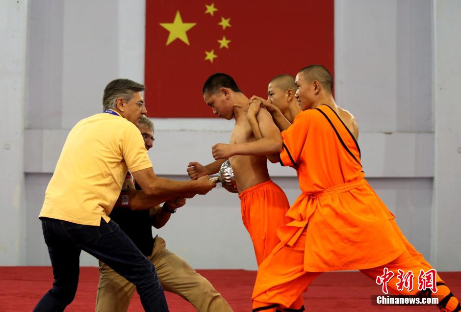 9月20日,河南登封,前来参加2015郑州航展的国际特技飞行员,在登封一所武校内用力想拔掉吸在少林弟子肚子上的饭碗,但拼尽全力,也未能成功。
