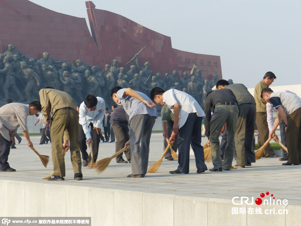 当地时间2015年9月15日在朝鲜平壤街头拍摄到的一幕。朝鲜人在工作中注重集体参与,即使很少的工作量,也是大家一起上,非常有趣。