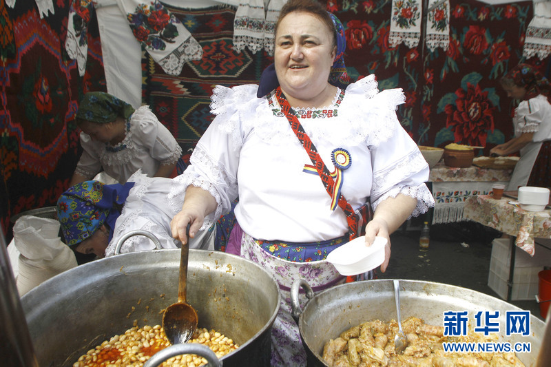 罗马尼亚传统美食酸菜卷(右)和煮大豆深受欢迎。新华社发(佩特雷斯库摄)