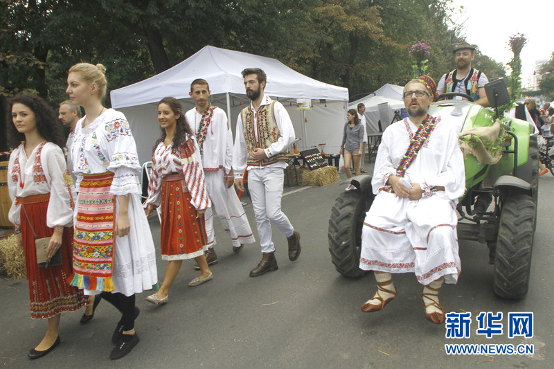 身穿民族服装在开幕式上巡游。新华社发(佩特雷斯库摄)