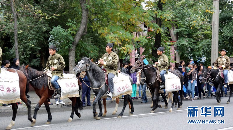 9月20日,驼队中的马队。一支由136峰骆驼,8匹马以及100余名身着古装的工作人员组成的中国大型仿古驼队,去年9月从丝绸之路起点西安出发,历时1年徒步行走1万多公里后,于9月20日抵达哈萨克斯坦最大城市阿拉木图。此次重走丝绸之路的活动是中国和哈萨克斯坦携手举办的大型文化项目。新华社记者周良 摄