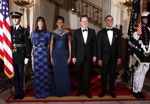美国总统奥巴马与夫人米歇尔2012年3月14日在白宫为到访的英国首相卡梅伦夫妇设宴。国宴众星云集,来自政界和演艺圈的众多大腕明星悉数到场。卡梅伦访美为期三天。13日卡梅伦抵达美国之日,奥巴马就邀请他共同乘坐“空军一号”,前往俄亥俄州的代顿市观看了一场大学生篮球赛。>>