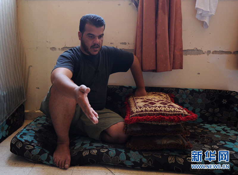 2015年9月20日,在叙利亚首都大马士革杜马尔地区临时安置所,费萨尔·艾哈迈德在讲述他们来安置所经过。费萨尔·艾哈迈德今年40岁,老家在叙利亚哈马省。家里兄弟三人,两个哥哥曾在叙利亚政府军中服兵役。2012年他们兄弟相约回家探望母亲时,反对派武装得知消息后绑架了他的两个哥哥,随后又烧毁了他家房子,无奈之下,他带着妻子和4个孩子辗转来到大马士革,栖身在这个临时安置所里。新华社记者张迺杰 摄