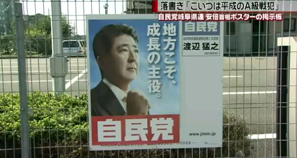 安倍海报被人涂鸦成"甲级战犯" 疑反安保法人士所为(图)